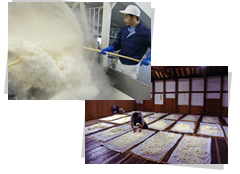 蒸し米に、麹カビを生やします。麹菌の持つ酵素の働きで蒸し米が溶け、蒸し米のデンプンが糖に変わります。微妙なコントロールが必要な作業で、温度、湿度、重量を24時間、コンピューターで管理しています。0.1%単位の水分量を監視しつつ、手で触り、麹の様子を目でチェックして、感覚による判断と併行し、最良の麹になるようコントロールしています。できた麹は徹底した分析を行います。